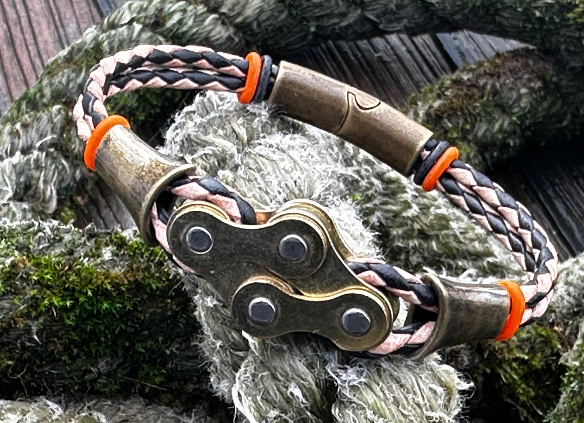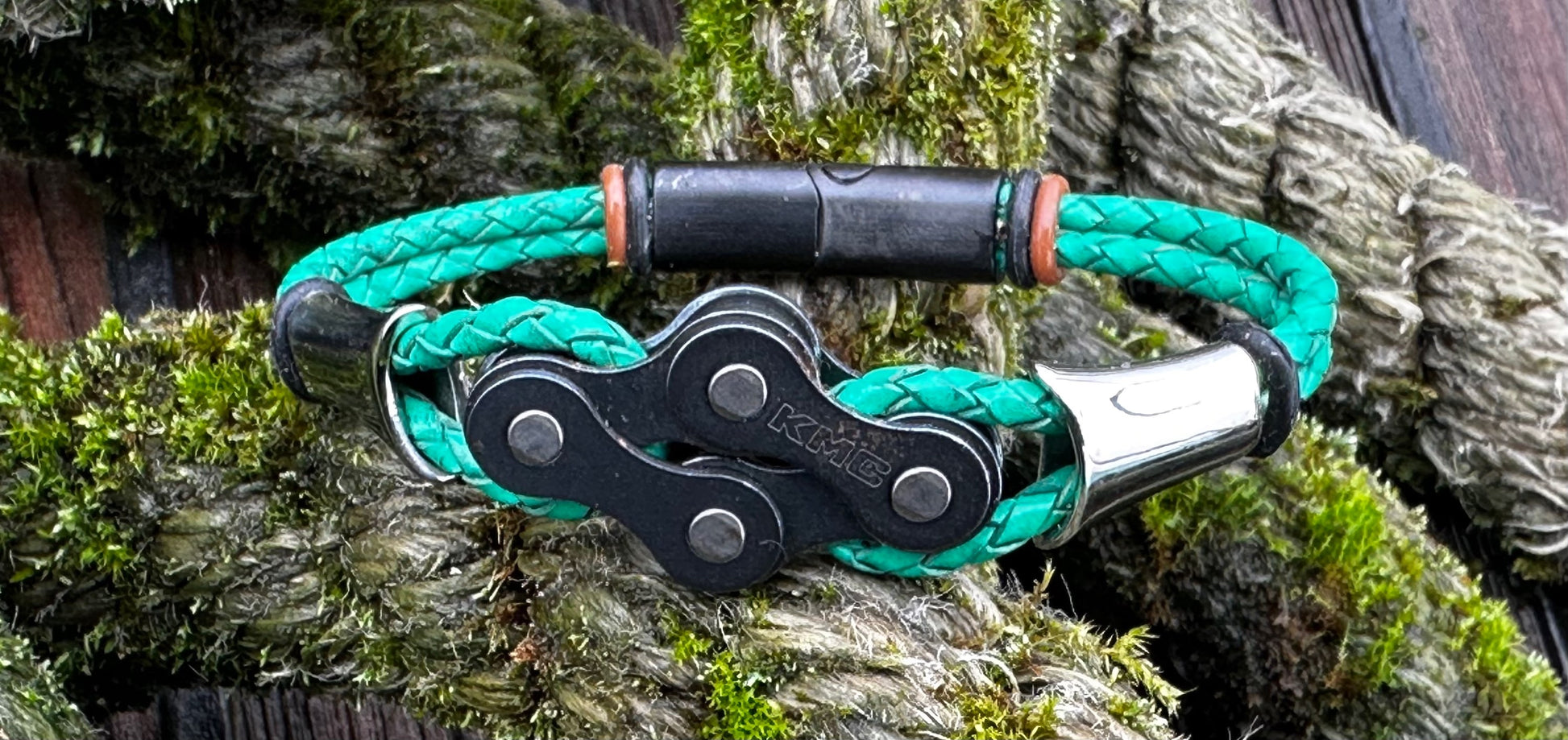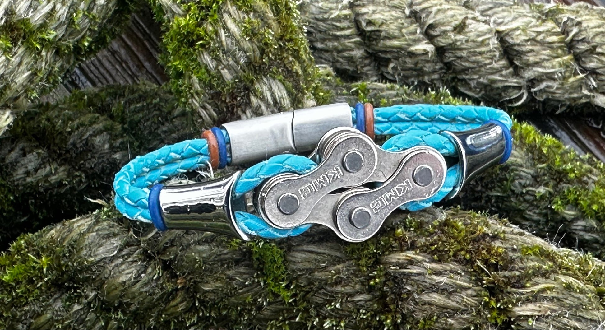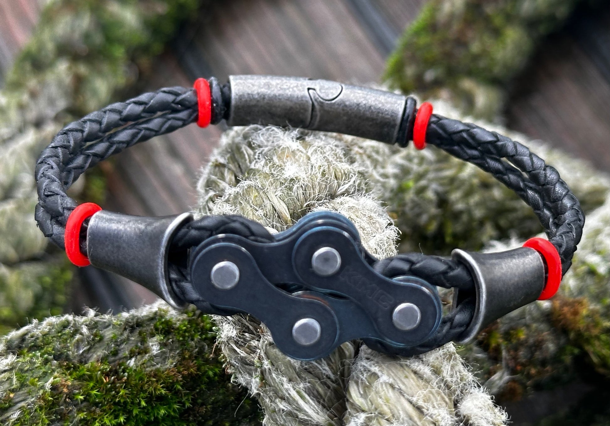 The links sit proud and evenly spaced, threaded onto round 3 mm braided leather that keeps the bracelet grounded and wearable day after day. Thereβs strength in the repetition, rhythm in the spacing β a quiet nod to cadence, miles ridden, and parts repurposed rather than discarded.