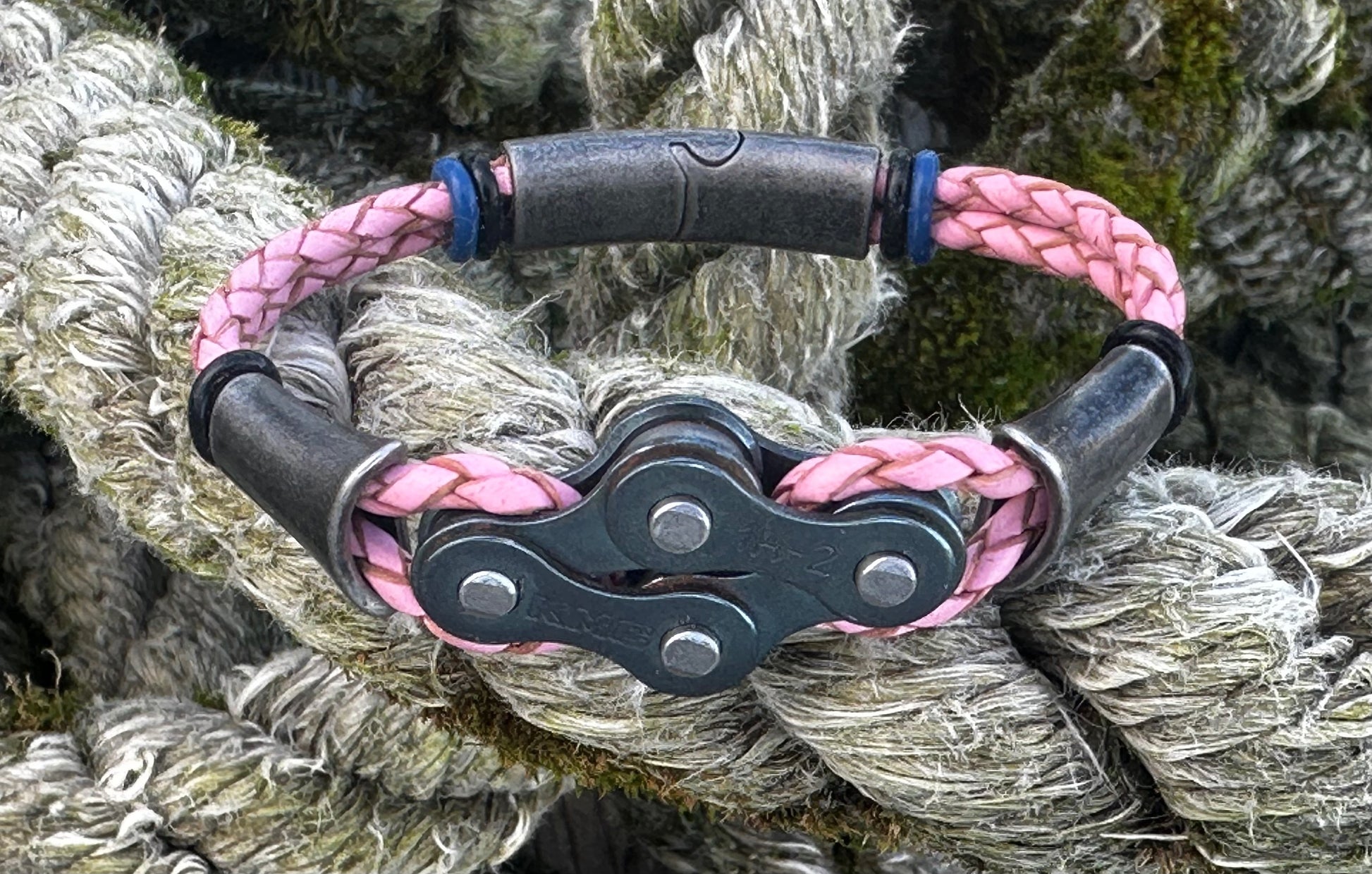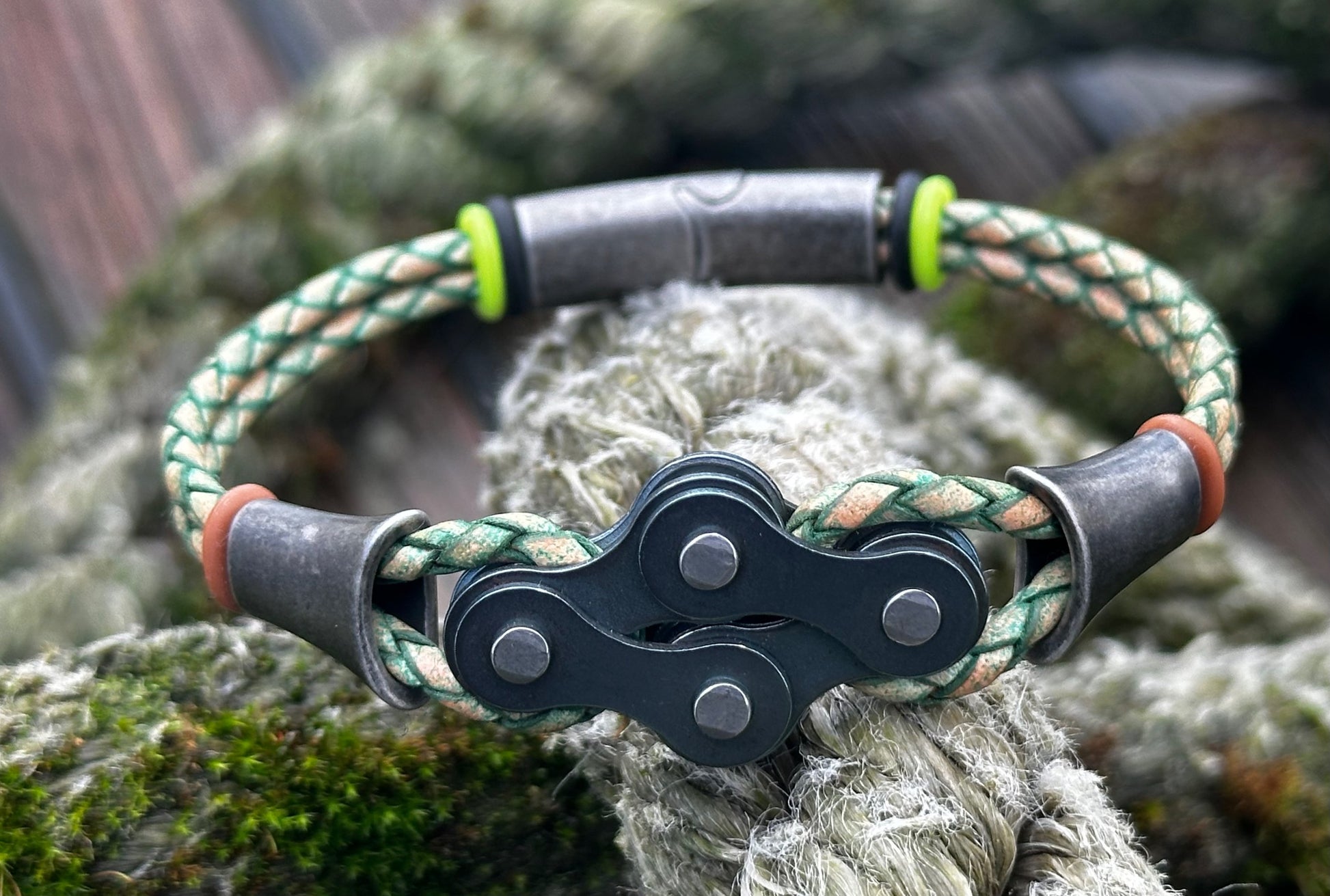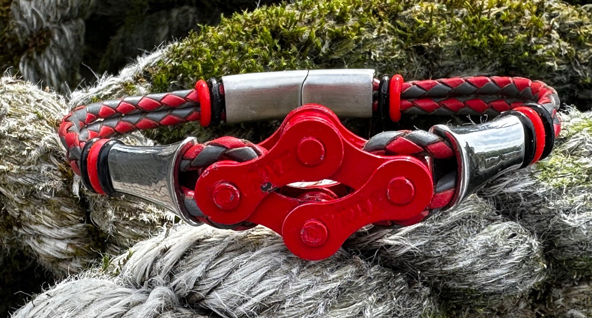 The links sit proud and evenly spaced, threaded onto round 3 mm braided leather that keeps the bracelet grounded and wearable day after day. Thereβs strength in the repetition, rhythm in the spacing β a quiet nod to cadence, miles ridden, and parts repurposed rather than discarded.