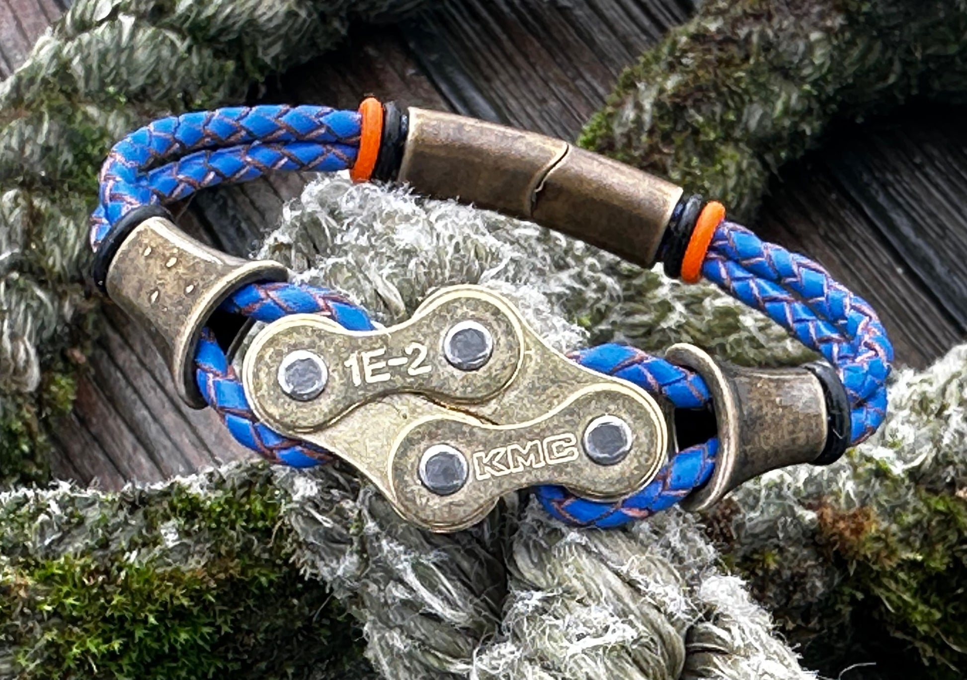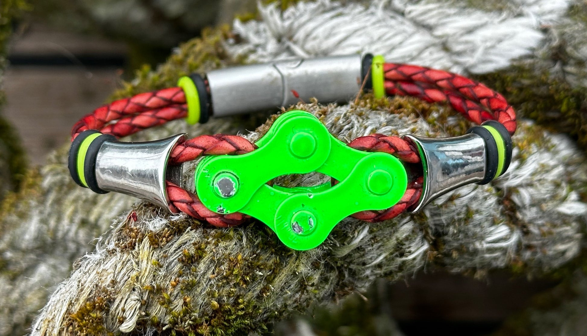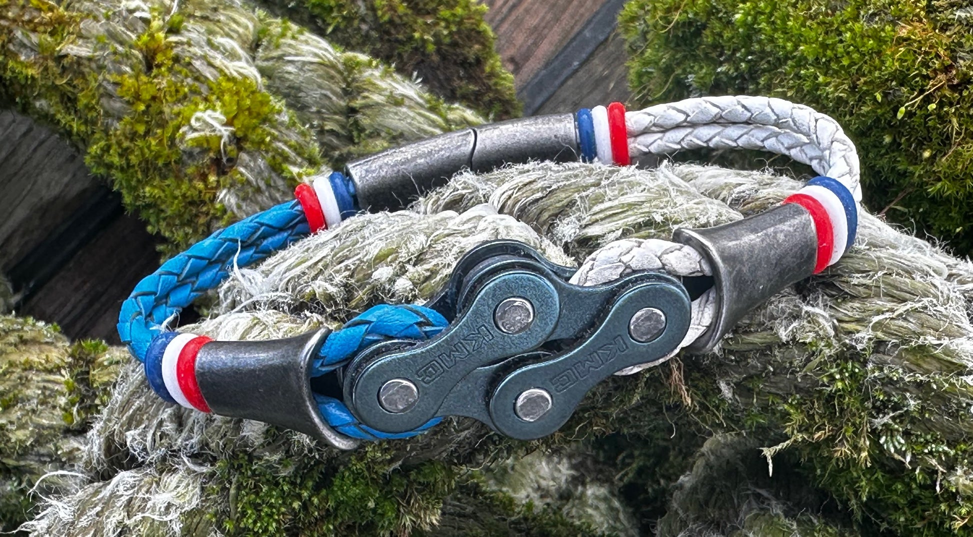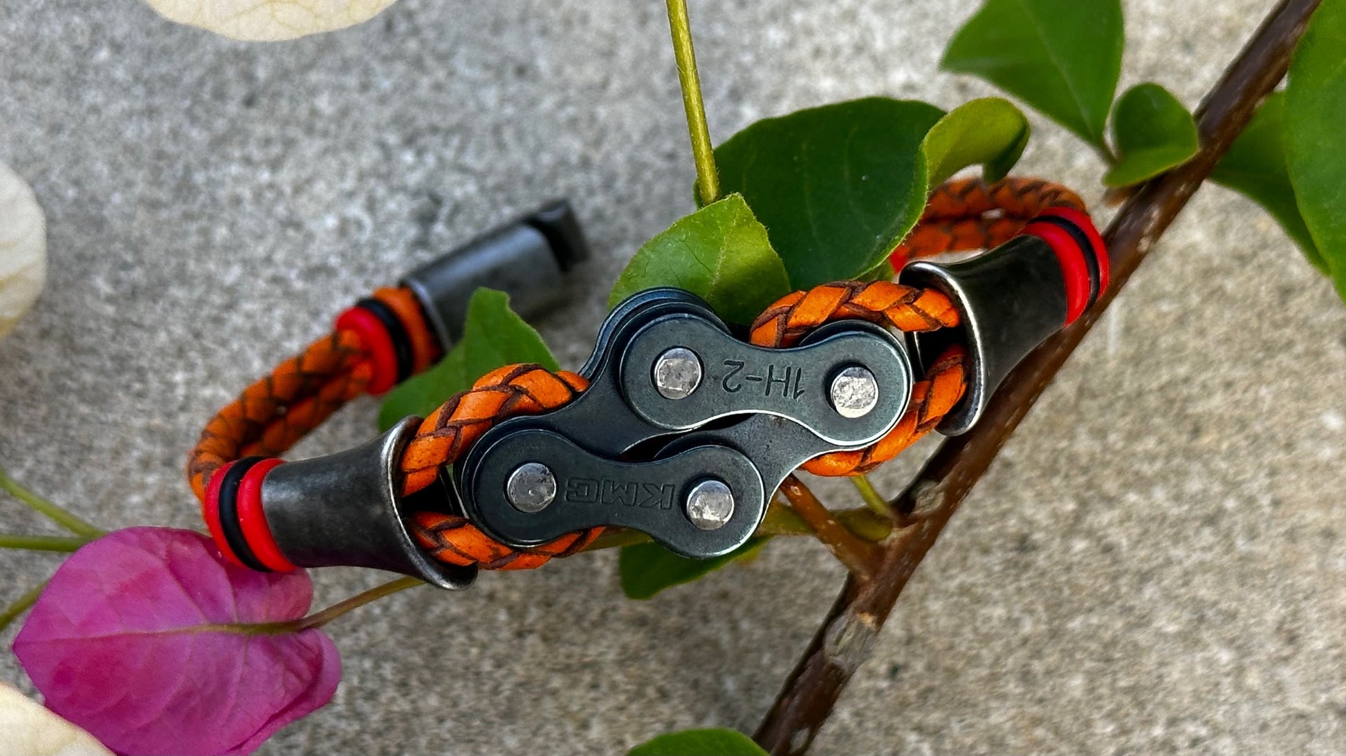 The links sit proud and evenly spaced, threaded onto round 3 mm braided leather that keeps the bracelet grounded and wearable day after day. Thereβs strength in the repetition, rhythm in the spacing β a quiet nod to cadence, miles ridden, and parts repurposed rather than discarded.