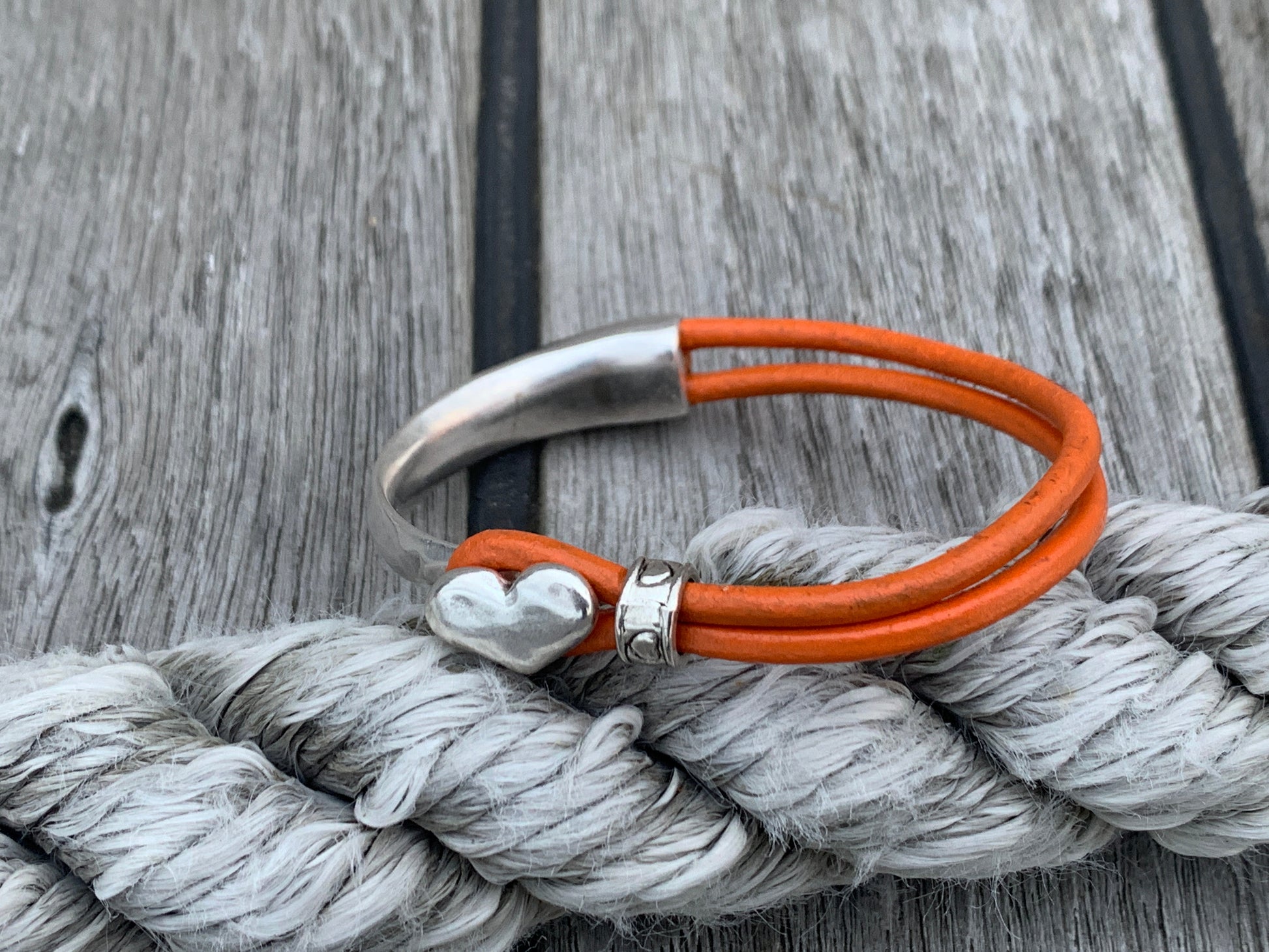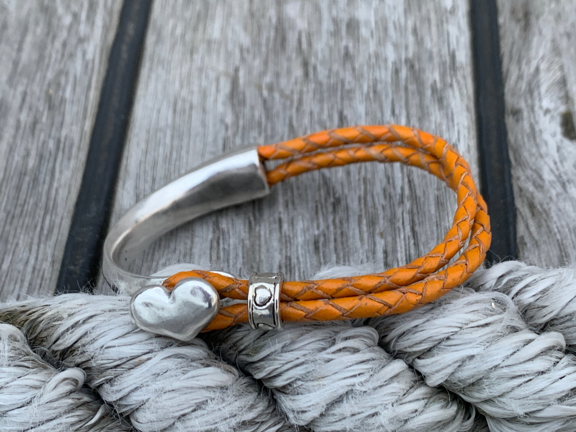 Half Cuff Heart clasp meta & leather bracelet. Available with 3mm solid round leather, or round braided leather cord.