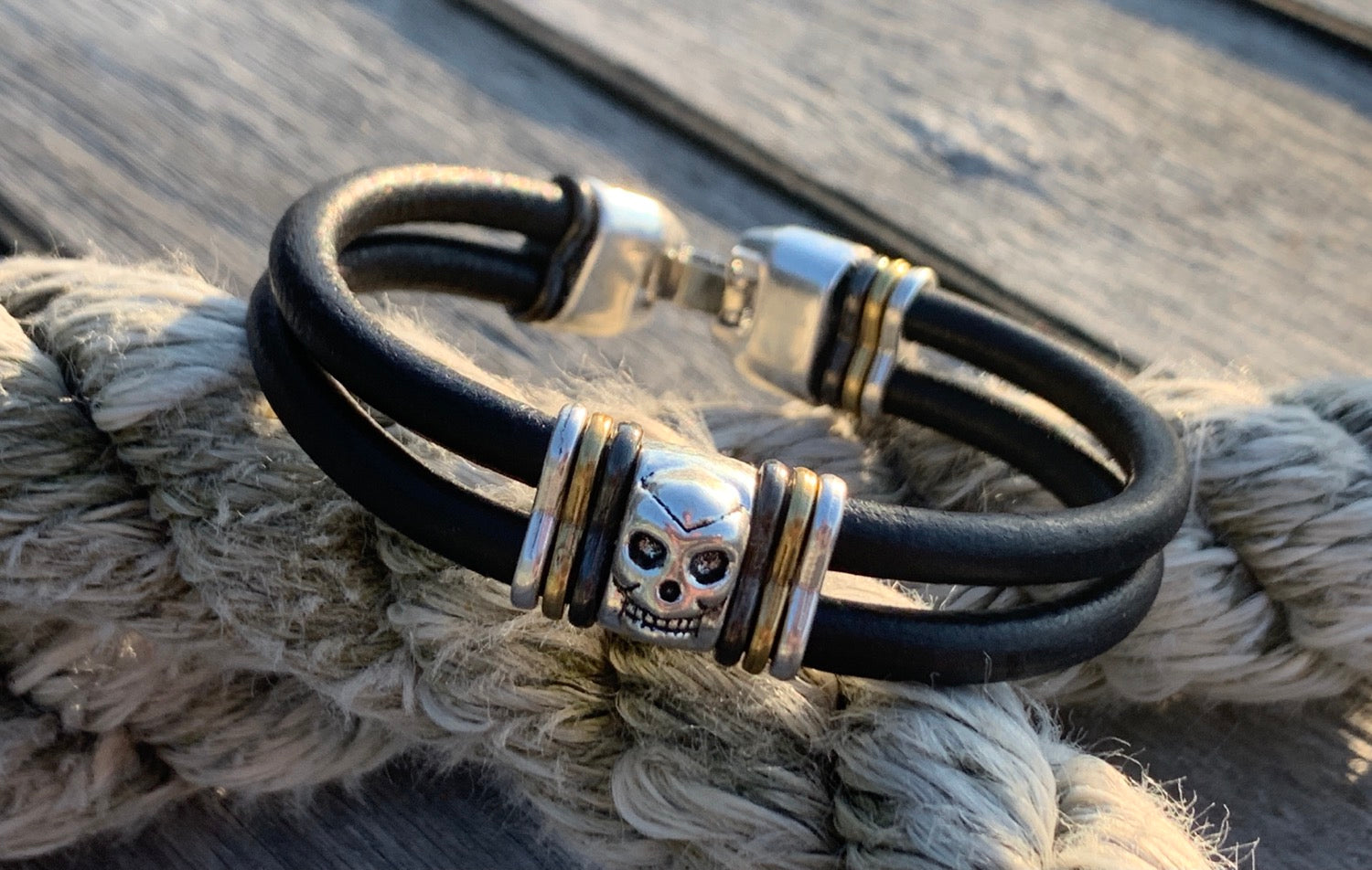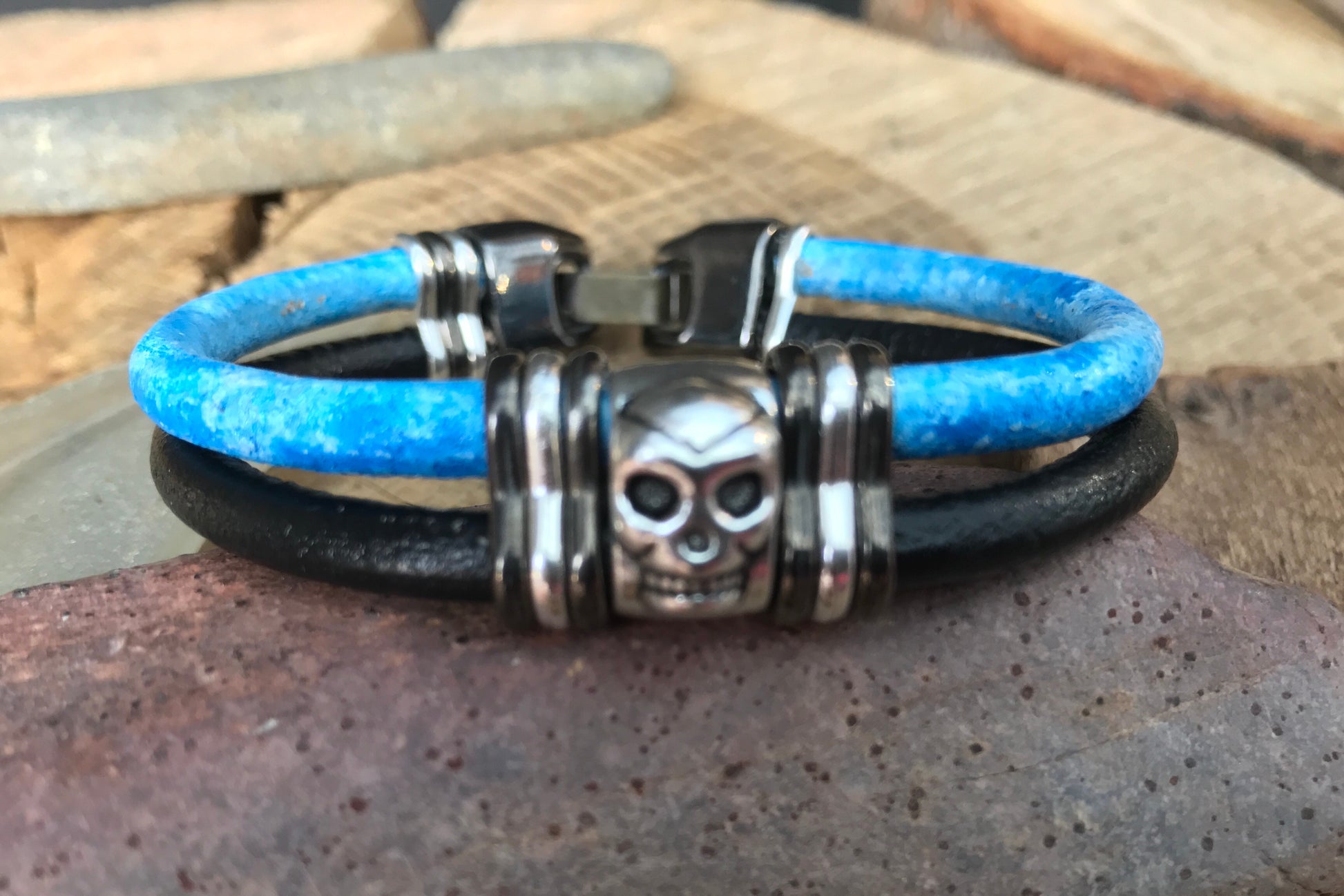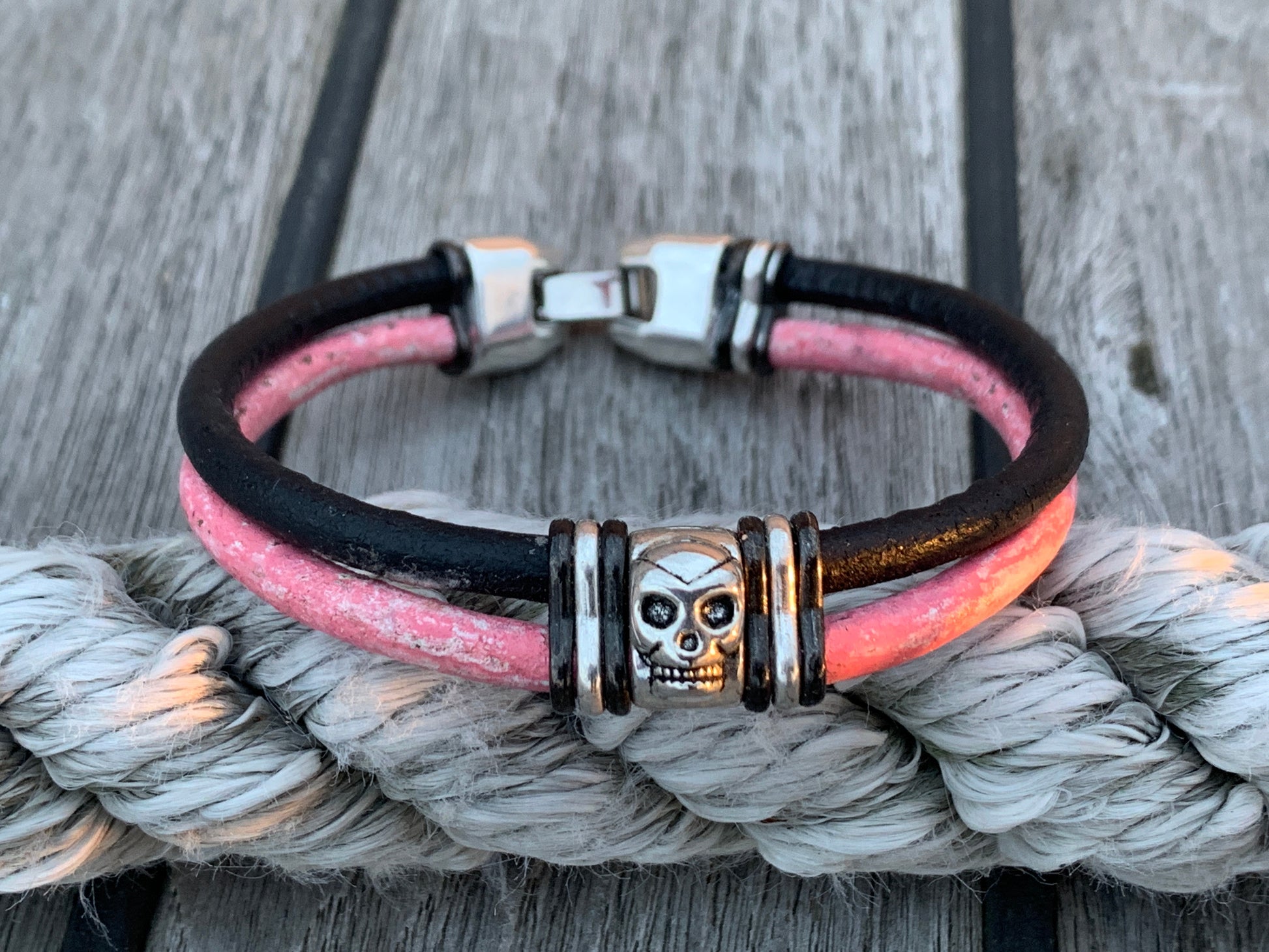 Two pieces of 5mm leather cord with silver skull and contrasting metal slices. Complete with JoeShmo logo clasp.