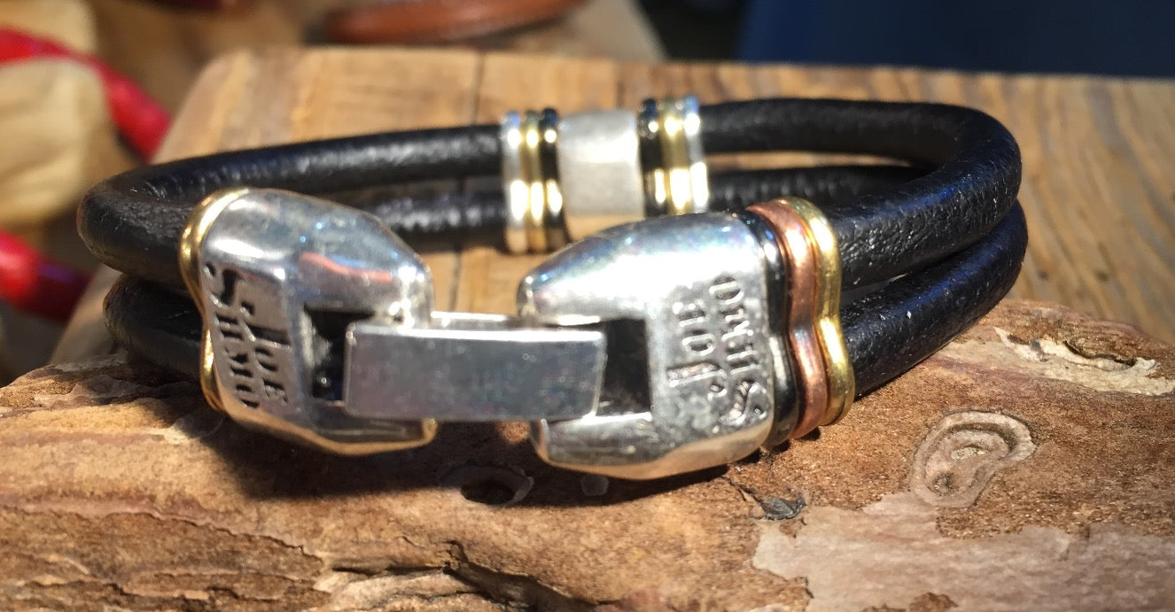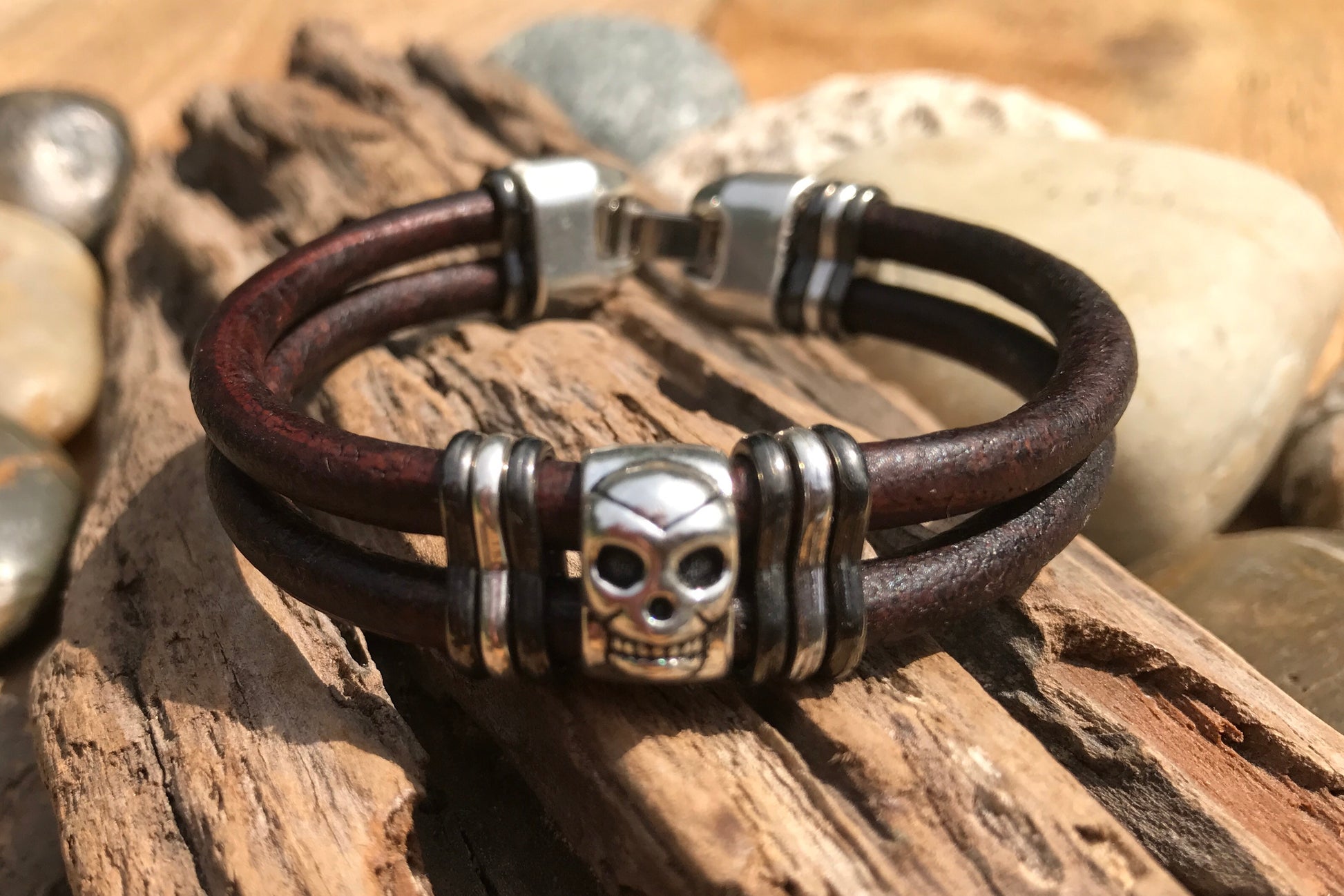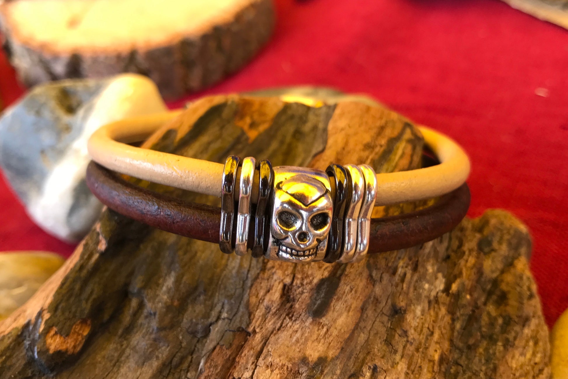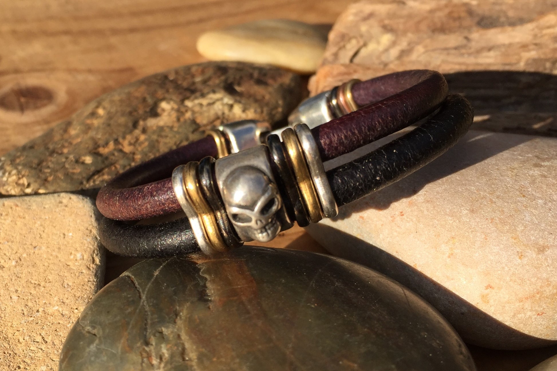 Two pieces of 5mm leather cord with silver skull and contrasting metal slices. Complete with JoeShmo logo clasp.