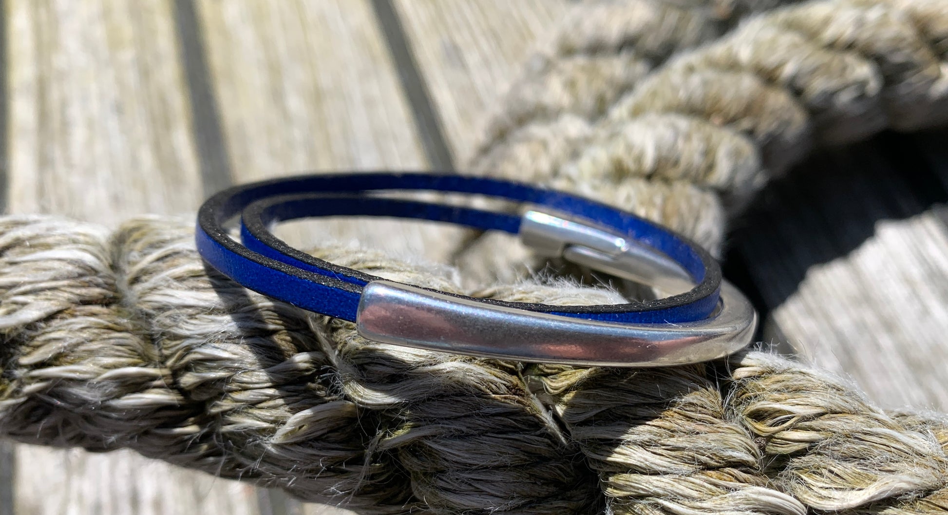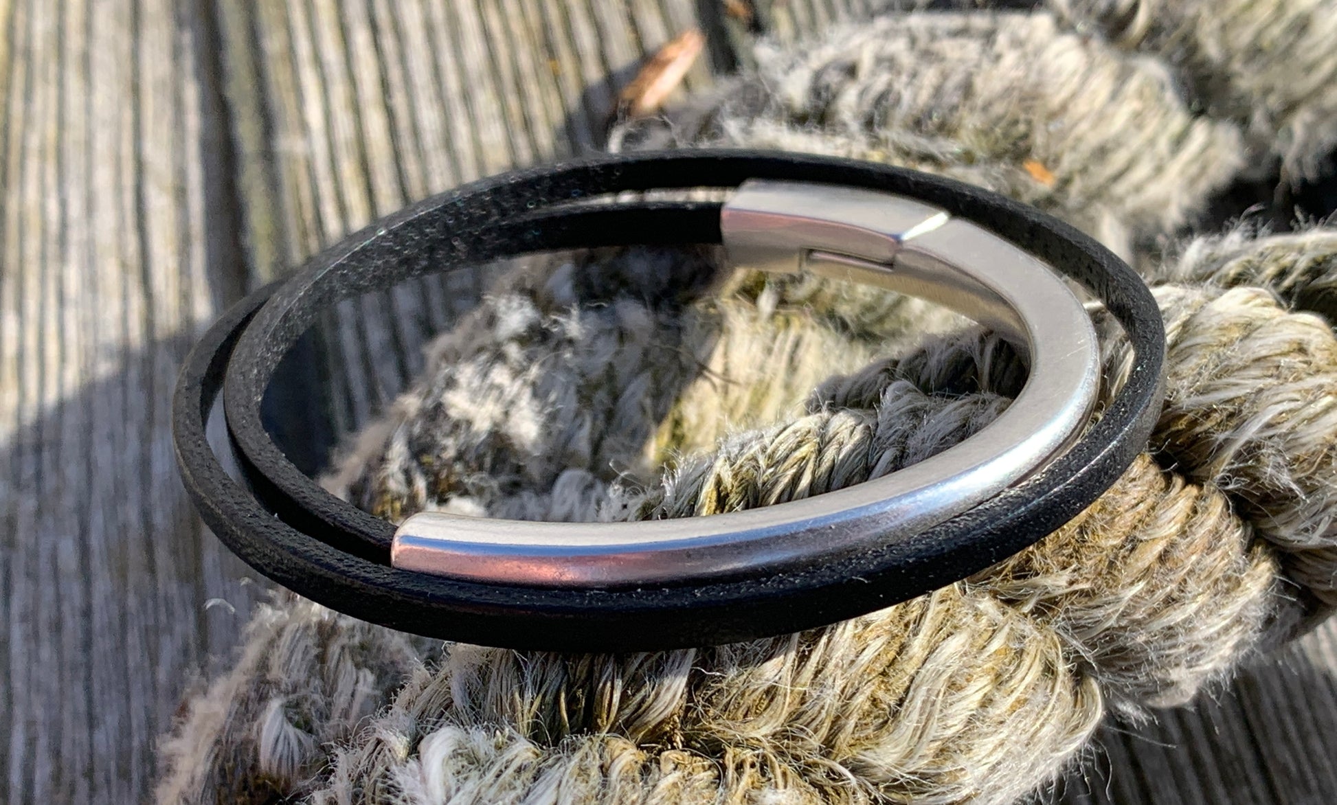 A sleek, sculptural bracelet featuring a double loop of supple 3mm flat leather, finished with your choice of gold or silver split cuff detail. Elegant and minimal, with just enough edge.