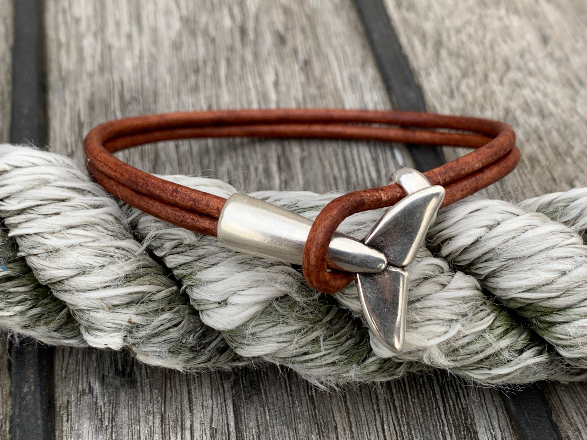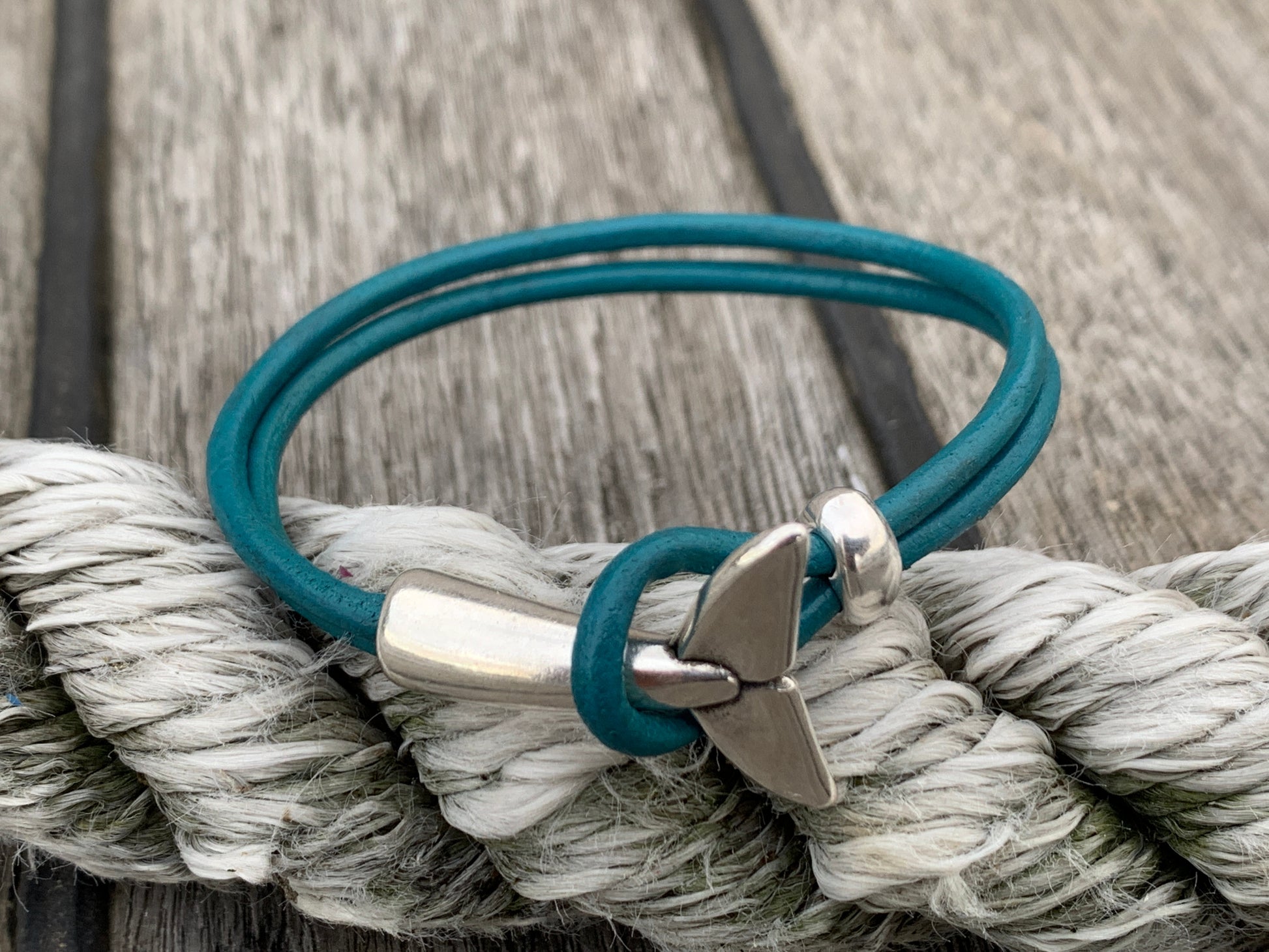 Whale Tale with silver or copper clasp, 3mm round leather cord and sliding lock. Available in a wide range of colours.